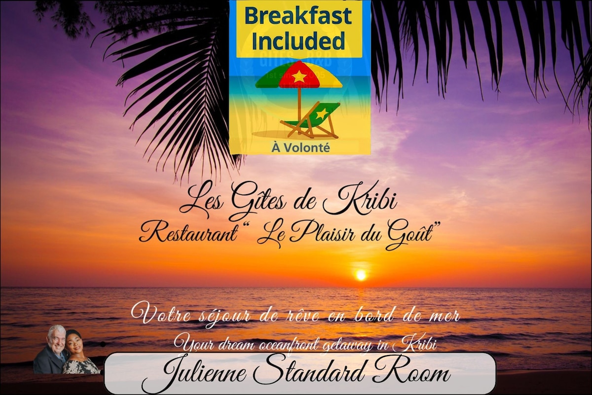 Chambre Julienne d’environ 20 m², à l’étage, avec balcon privé donnant sur les palmiers et les jardins des Gîtes de Kribi. Lit double confortable, salle de bain attenante de 5 m² avec douche et WC, TV écran plat, réfrigérateur, plateau de courtoisie avec cafetière. Grande baie vitrée pour profiter de la lumière naturelle. Accès rapide aux 2 piscines, à la plage et au restaurantavec une ristourne de 10% pour les clients Airbnb. Petit-déjeuner compris.