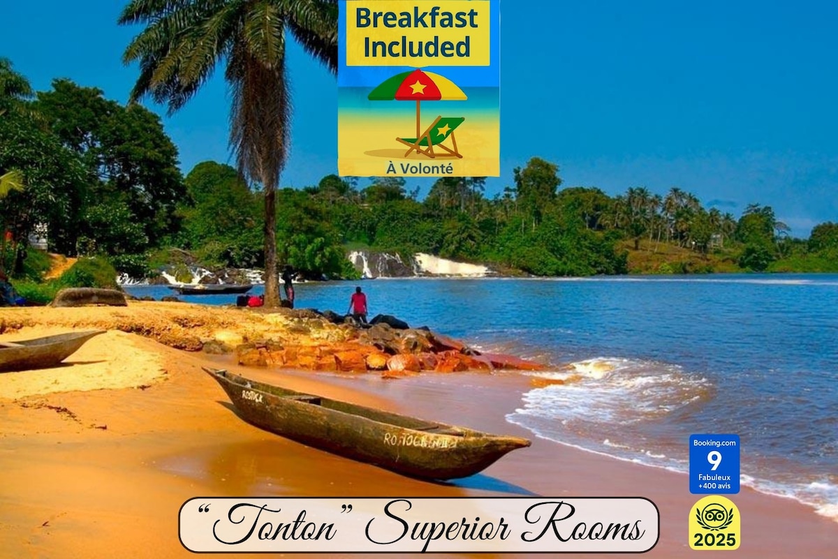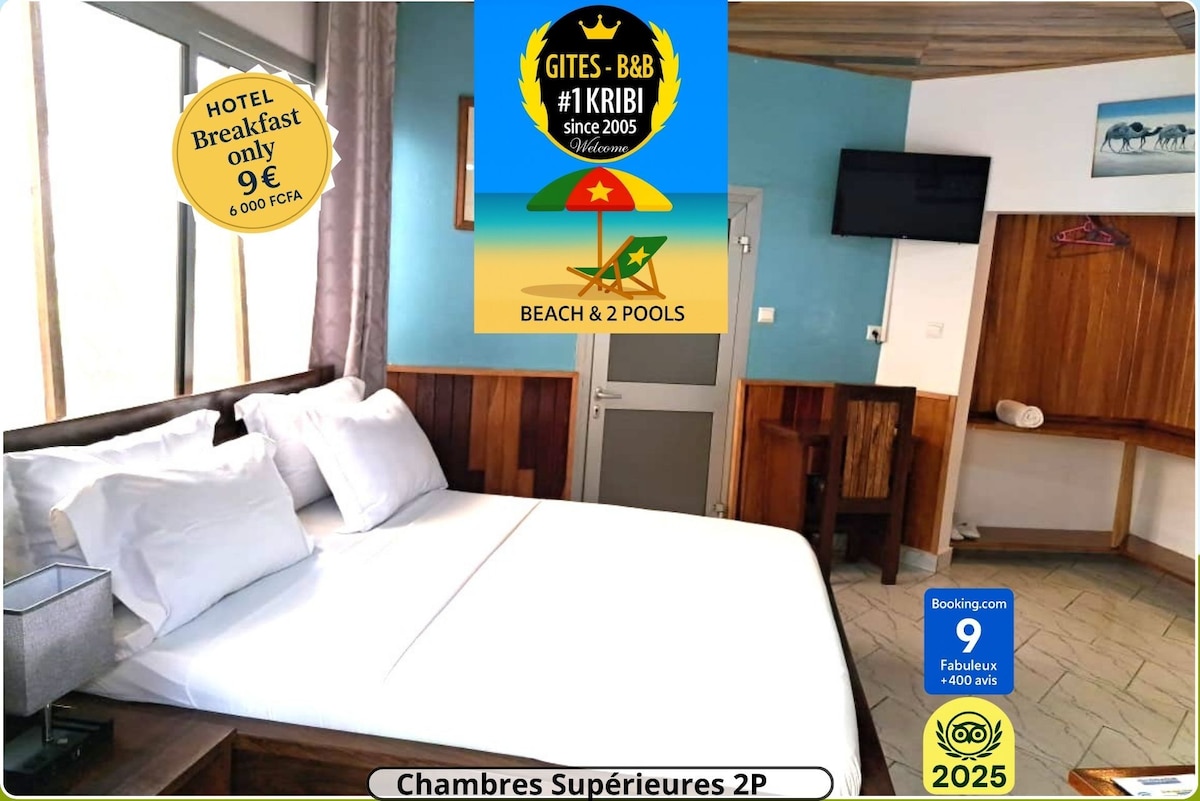 All-you-can-eat breakfast included. Cozy and comfortable room within the Gîtes de Kribi resort, ideal for a budget-friendly stay while enjoying the services of a full-fledged hotel: 2 swimming pools, beach just steps away, Wi-Fi, parking, 24-hour security, and a jacuzzi. You also receive a 10% discount on all your meals at the Au Plaisir du Goût restaurant. Just minutes from the Lobé Falls and downtown Kribi, enjoy a tropical atmosphere and a warm welcome from the staff.