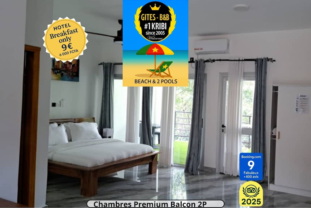 Let yourself be charmed by this delightful accommodation. This elegant and bright Superior Double Room features a bathroom with a bathtub and shower, and is just steps from the beach. It includes a queen bed, air conditioning, Wi-Fi, TV, desk, and storage. Enjoy the garden view from the balcony. Included access: 2 swimming pools + jacuzzi, secure parking, 24/7 reception. Restaurant Au Plaisir du Goût (-10%) is located right on the beach. Nature excursions (Lobé Falls, etc.) are also available.
