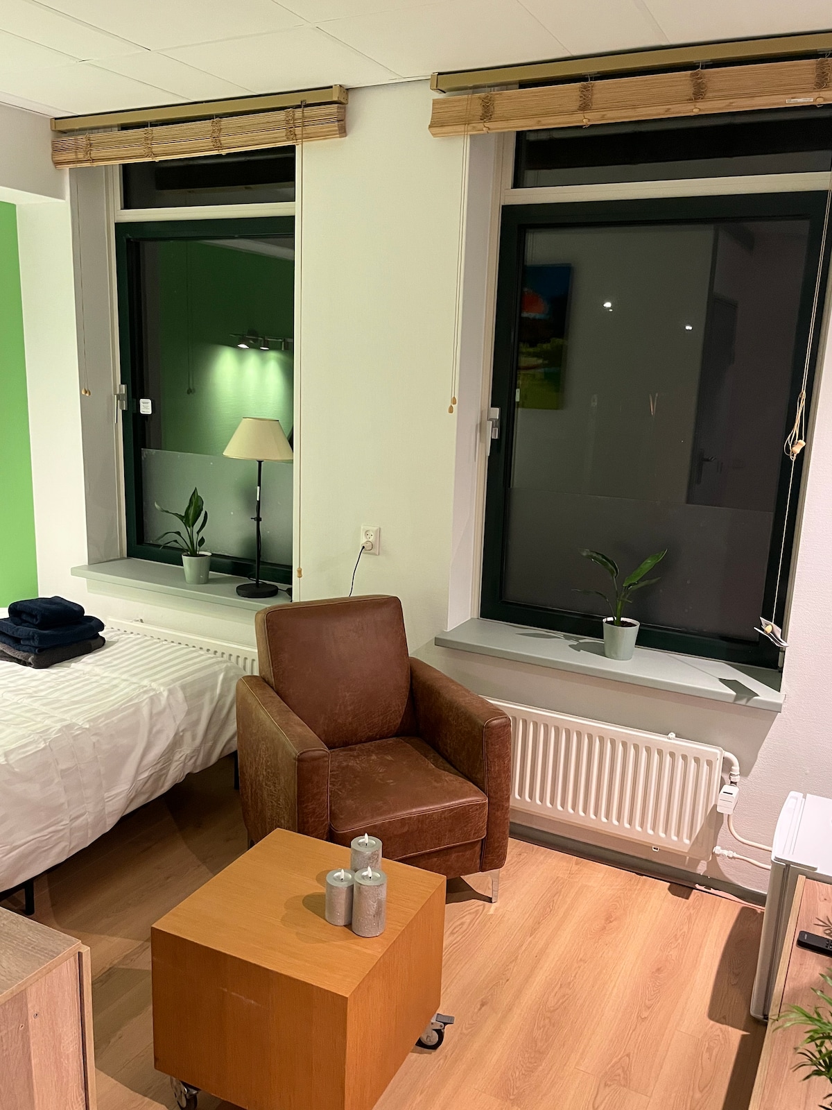In the middle of the center of Gouda you will find this compact studio with everything you need. The studio has a TV, dvd-player, high speed WIFI, refrigerator, microwave, stove with oven, washingmachine and a bathroom. There is a backdoor with opening doors to a small patio. In the hall you can leave your bikes safely.