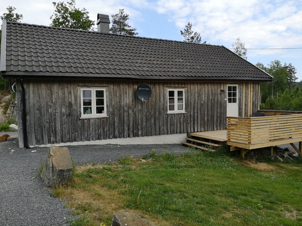 20 min from R9 (Hornnes). 60 min from Kristiansand. Adress is Abuslandvegen 1180 Perfect location for hiking. Perfect bathing area in the river 1000 m from the cabin . Don't need a fishing license and boat can be avialable upon agreement. It's all kitchen supplies and a gas grill. Wood for outside grill located under cabin.