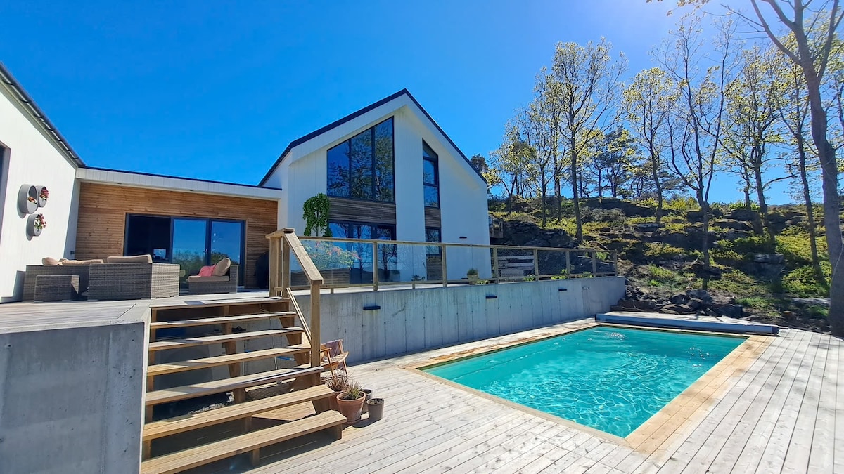 Sjønær hytte med panoramautsikt - sol hele dagen. Hytta ligger usjenert til med direkte tilgang til fine bademuligheter - 50 meter unna. Ny hytte (2023) på 220 m2 med 4 soverom, 3 bad, 2 stuer m/ peis, moderne kjøkken, vaskerom, Internett og smartTV. Gassgrill på terrassen. 2 parkeringsplasser med EL-lader. Båtplass. Fine fiskemuligheter. 2 kajakker og shuffleboard. Perfekt sted for familie med opptil 10 personer. Kort vei til butikk, ca 15 min kjøring til Kristiansand.
