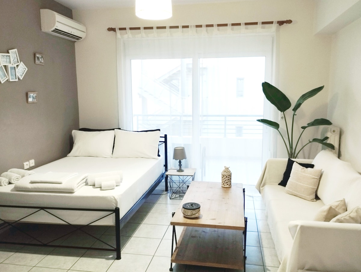 Located in the center of the city,only 750 meters (9 minutes walk),60 m2 Apartment in 3rd floor with 1 bedroom, single living room - kitchen,large balcony and 1 bathroom. The apartment has 1 large double bed, 1 sofa bed, A/C, Wi-Fi, TV, washing machine and many electrical appliances. In a very short distance from the apartment there are: supermarket (20 metres), gas station (240 meters), Bus station (3 minutes walk), bakery (60 meters), café (60 meters) etc
