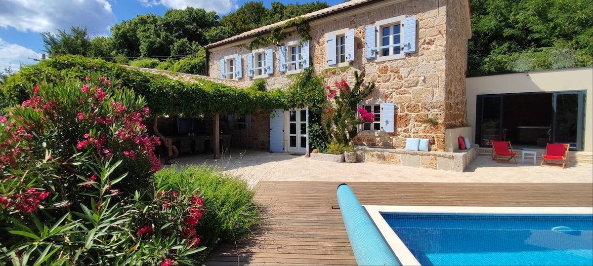 Vila se nahaja na osami in je od vasi oddaljena cca 200 metrov Sestavljena je iz avtohtone kamnite hiše iz začetka 19. stoletja, ter novega dela, v katerem dominirajo velike steklene površine, ki notranjost hiše spajajo z zunanjostjo. V starem delu hiše je spalnica, v novem pa dnevno bivalni del s kuhinjo in veliko kopalnico. Okolica hiše meri 1000 m2. Na njej je osem stoletnih dreves, ki lahko nudijo zašcito pred soncem. Na razpolaganje sta vam dva vrtova s sezonsko zelenjavo.
