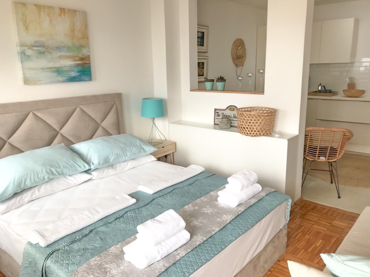 Welcome to Oprna – a first-floor studio in our family-run Sunshine Residence with 7 sea-view apartments, just 150 m from the beach. Experience calm and connection in this spacious 35 m² studio, perfect for two. Step onto the balcony with seating and enjoy fresh air, sun, and uninterrupted views of the Adriatic Sea – the perfect setting for morning coffee, slow lunches or sunset drinks.