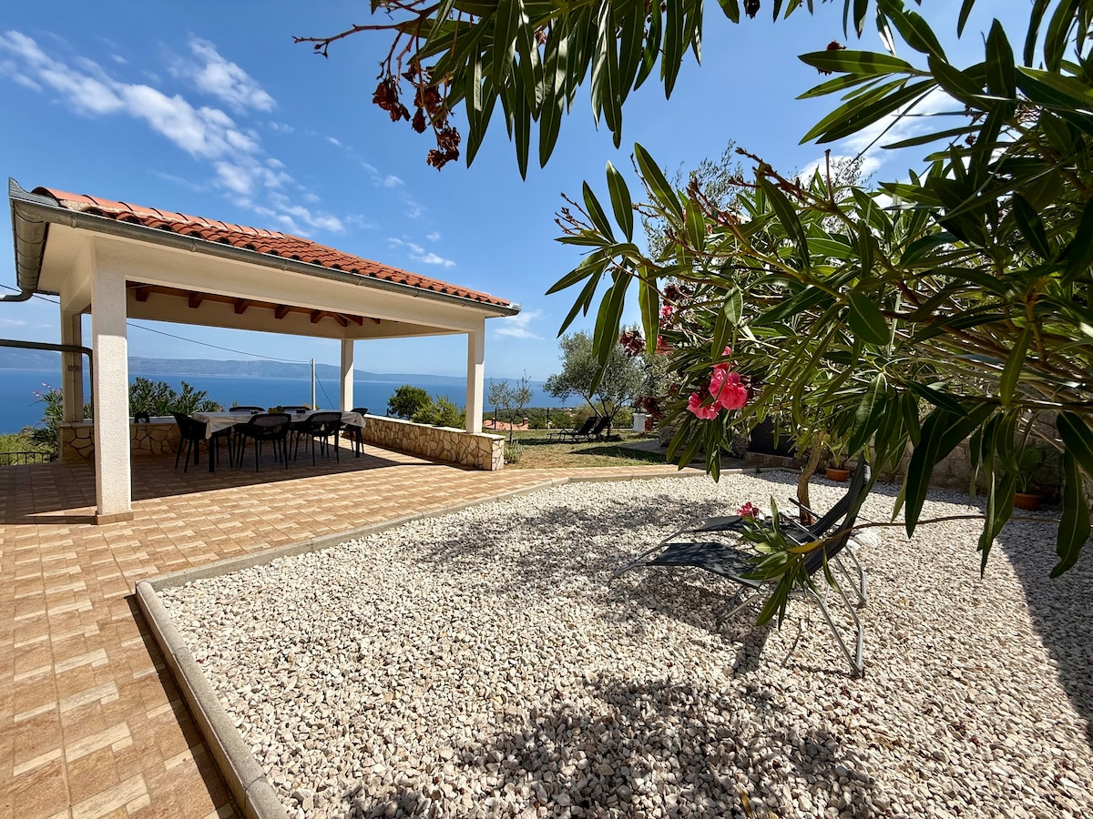 A perfect house for 2-3 families or friends! Our air-conditioned, 195 sq m "Villa Leca" with a heated outdoor pool and sauna accommodates 8 (+4) adults. All 4 bedrooms have a double bed and an en-suite bathroom. One of these bedrooms also has an additional double bed and a sofa bed. Three bedrooms have balconies with mountain/sea views. The private pool area is equipped with sun loungers and an outdoor shower.
