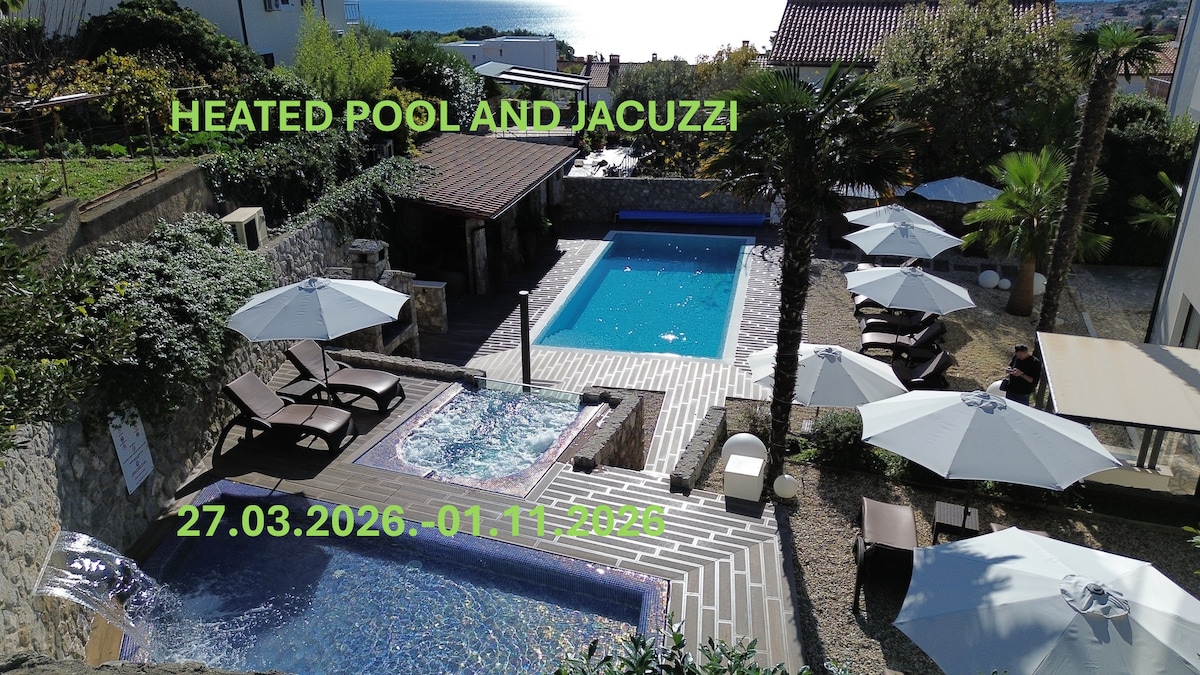 Capacity 2+2, size 42 m2, with a large fenced yard and a swimming pool. Located on the ground floor in a family house in a quiet street; newly built and is fully equipped and furnished. The house is surrounded by trees and offers an unobstructed view of the sea. Pets are not allowed, nor is smoking in the apartment. It is accessible for disabled. Heated pool (May-October) : 8x4m, depth 1,5m. Sat TV, WiFi, A/C, safe, parking, fireplace/grill, terrace, deck chairs and a parasol by the pool.