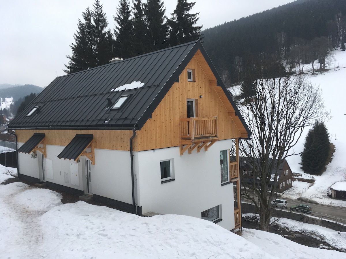 This modern house, built in 2015, is a part of semi-detached house and is located 10 min walk from the parking lot near the cable car lift to Snezka. Skibus stop is located 100 metres from the house. There are two bedrooms with a double bed, bunk bed and en-suite bathroom in each of them. The house has a living room with a TV and fireplace, equiped kitchen and a dining table. There is also a garage and infrasauna. The house is great for family vacations. No parties please.
