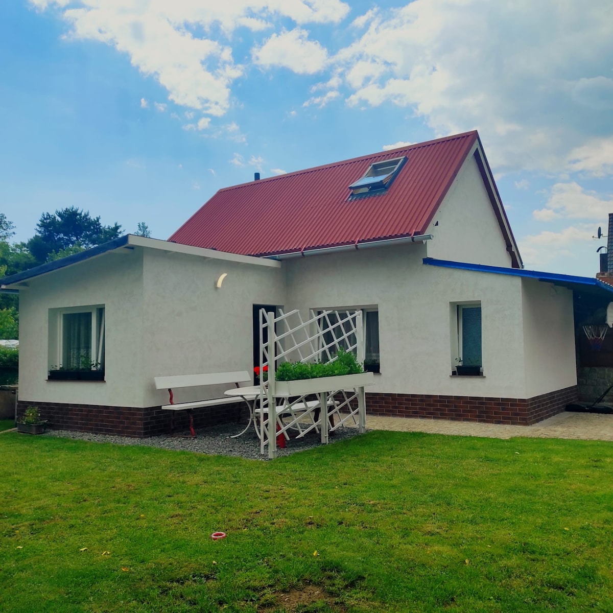 Niewielki domek dla 3-4 osób – rodziny i grupy znajomych. Na krótkie pobyty jest możliwość noclegu 5 osoby Parter zajmuje pokój dzienny, kuchnia i łazienka. W pokoju dziennym znajduje się stół z krzesłami, fotel, kanapa, TV Kuchnia wyposażona jest w lodówkę, kuchenkę z piekarnikiem, czajnik, komplet garnków, naczyń stołowych, sztućce, lampki do wina... W łazience jest kabina Na poddaszu jest przytulna sypialnia z możliwością przedzielenia ruchomą ścianką. Domek jest ogrzewany kominkiem.