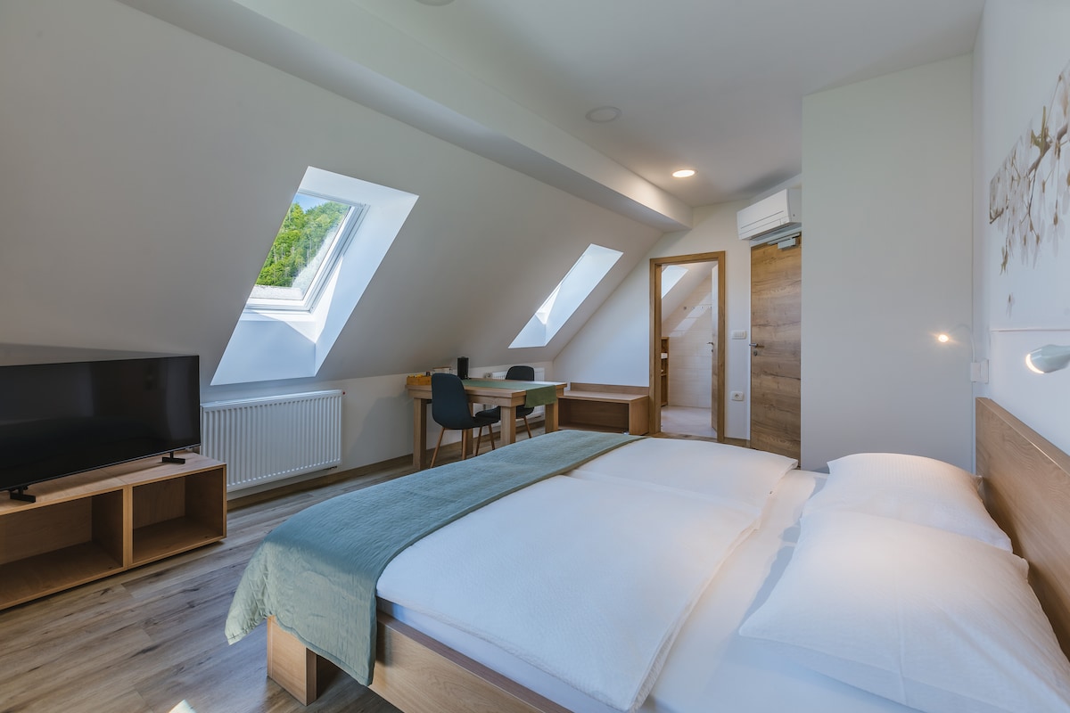 Small appartment located in a village two kilometers far from Bled with very nice view, surrounded by forest and meadows. Close to the house there is a footpath to Vintgar gorge . It is perfect for couples, friends ,solo adveturers. Evenings here are magical because of beautiful sunsets and sounds of nature. Located in Bled, 2.8 km from Grajska beach and 5 km from Bled Castle.