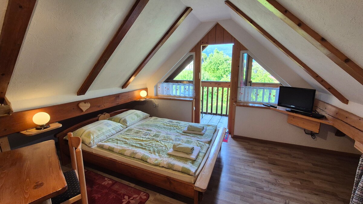 Jack's studio apartment is located in the beautiful and peaceful village of Bohinjska Bela, not far away from Lake Bled, Lake Bohinj, Vintgar gorge and Triglav National Park. The studio apartment has a spacious terrace with a view of forest, pastures and mountains. Guests can relax and enjoy the nature or do some activities as hiking, climbing, cycling, swimming, fishing, etc.