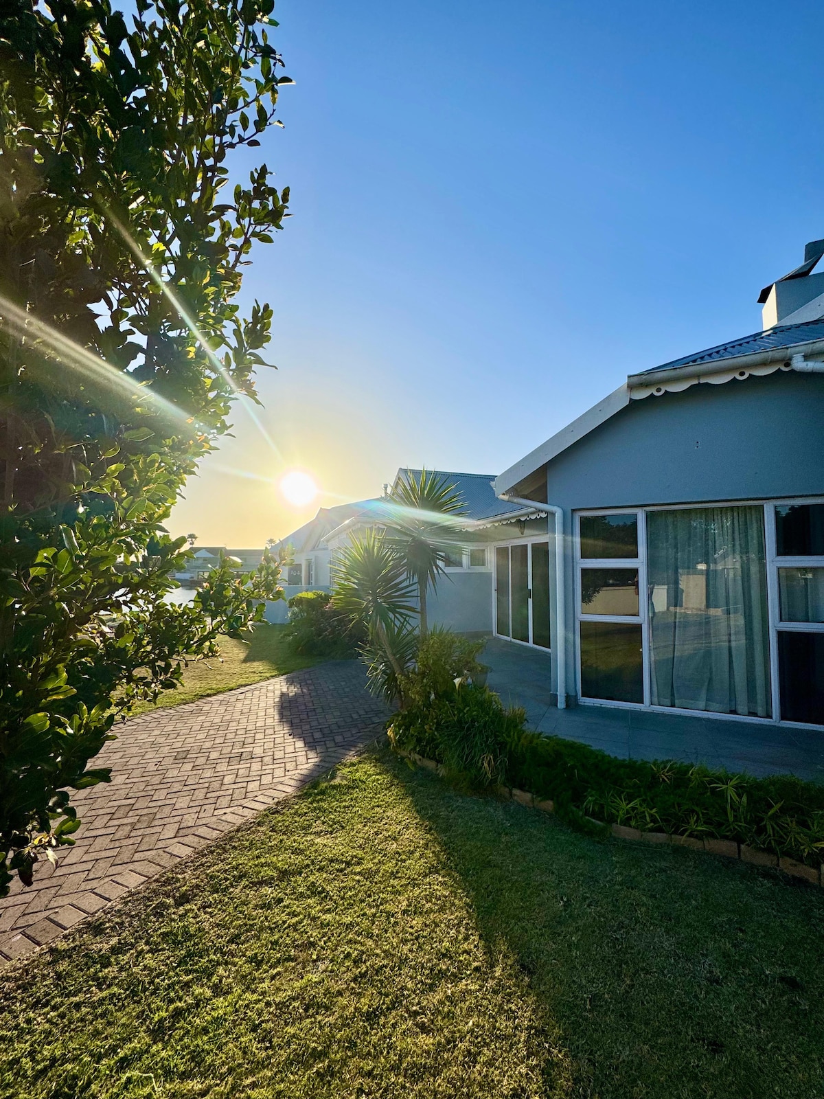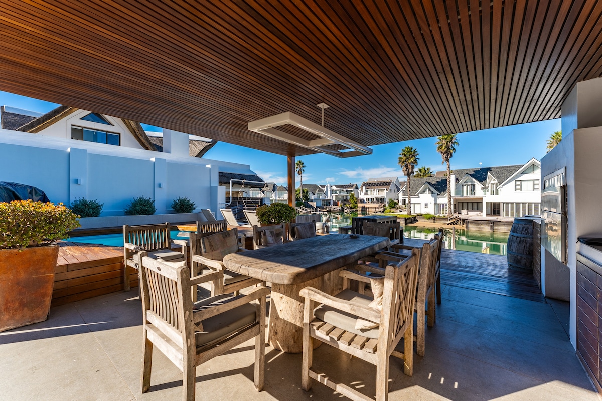 Modern, spacious 5 bedroom home situated on the canals in the exclusive, access controlled, Long Island Estate. Amazing indoor/outdoor flow from lounge and TV room onto wooden deck, private pool with optional heating, under cover braai area & canals with beach and moorings for a boat & jetski. There are 2 outdoor dinning tables for al fresco dining. Keyless entry and free wi-fi. Loadshedding - we have a battery backup system for the Lights, the Fridge, the Wi-Fi, the Decoders & 3 TV's.