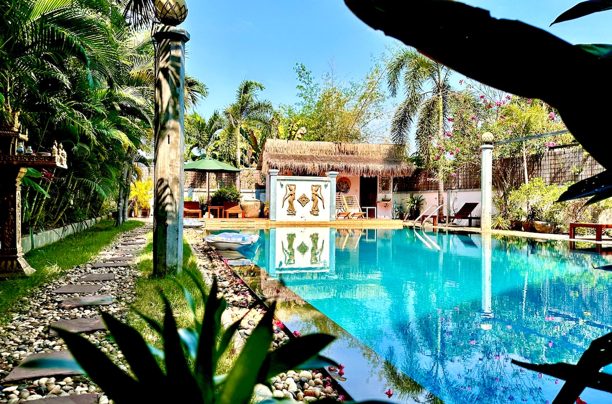Runned by a cambodian family. In a tropical garden, property of 9 private villas offering an outdoor pool. Carving gallery as reception. A very quiet place, even just 250m from Old Market. We propose breakfasts by ordering to local businesses (fruits, pastries, omelettes, rices... ). Airconditioning, free WiFi access, spacious bathrooms, free toiletries, hairdryer and bathrobes. Linens and towels can be changed upon request We also can assist with ticketing and tour arrangement.