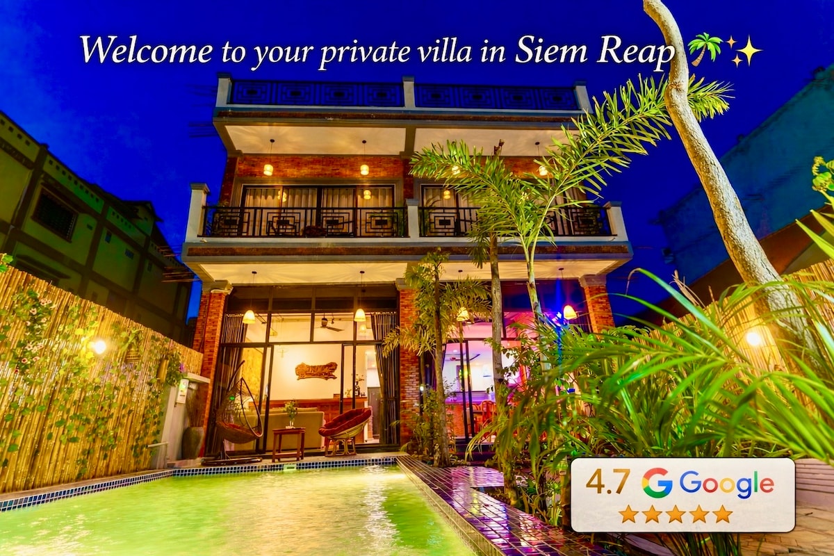 Welcome to your private family-friendly villa in Siem Reap! Relax in comfort with your own private pool, a fully equipped kitchen, and air-conditioned rooms—some offering balcony or garden views, and others featuring a private hot tub for a luxurious touch.,Conveniently located just 1.8km from Pub Street and the Old Market,, this villa puts you close to the city’s best attractions, locals restaurants at Khmer Pub street or National museum Royal Place Whether you’re traveling as a family,friendly