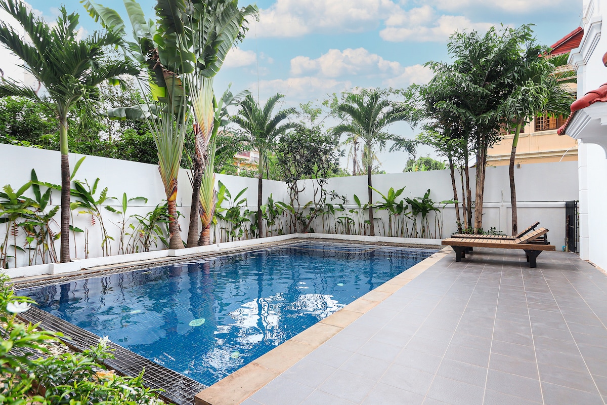 A spacious boutique home of 5 bedrooms with a private pool, built in a unique style of Khmer and Western architecture with an oasis ambiance, located near the largest local market of Siem Reap, only 10 minutes from downtown Pub Street, and 15 minutes to the marvelous Angkor Wat. This beautiful villa is ideal for a group or a family to enjoy a private stay and feel as if you are at home. Authentic Khmer meals, transport/guided tours, and airport transfers could be arranged during the stay.