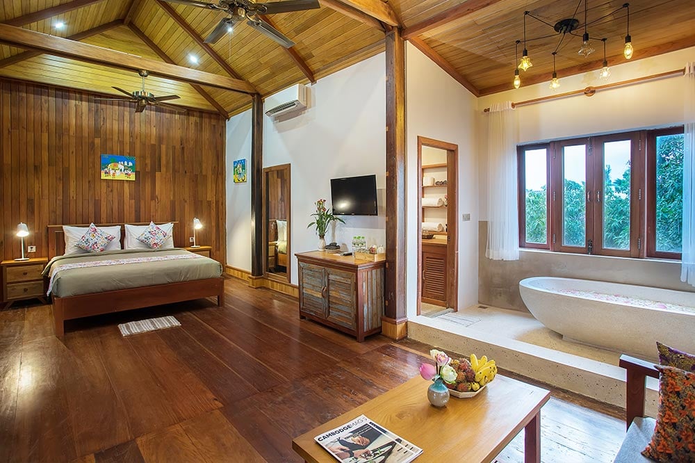 Surrounded by trees and space, giving you a sense of living within a peaceful ambiance, our Family Private Pool Villa is strongly recommended for your family trip or group of friend, - 02 x bedrooms (1double room & 1single room) - 01 x livingroom, kitchen, microwave, minibar - 01 x private pool and terrace - Spacious bathrooms with bathtub, showers and hot water - High speed internet Wifi (private router) (we offer free extra bed for family traveling, placed in the livingroom)