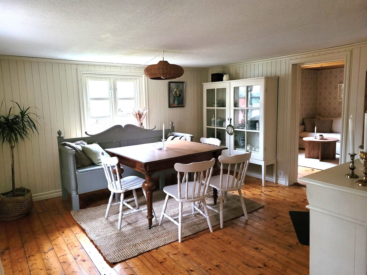 Ett smultronställe med naturen precis inpå knuten! Det lilla torpet med anor från 1800-talet ligger mitt inne i en bokdunge mellan sjön Bolmen och Unnen. Här finns oändliga möjligheter till härliga skogspromenader, fisketurer, cykelturer, bad eller varför inte läsa en bok framför brasan och njuta av tystnaden. Stugan ligger bara 2,5-3h från köpenhamn via Öresundsbron och en timme från terminalen i Halmstad för färjan från Grenå.