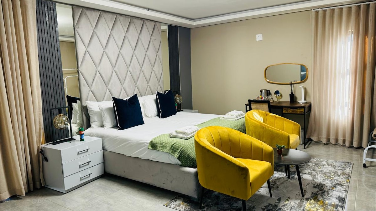 This elegantly designed room offers a private garden patio, creating a tranquil retreat for relaxation. The room is thoughtfully furnished with luxurious amenities, including a plush king-sized bed, premium linens, and a spacious en-suite bathroom with high-end toiletries. Modern conveniences such as a flat-screen TV, high-speed Wi-Fi, and air-conditioning ensure comfort and connectivity. Khiwane Boutique Hotel enhances your stay with full-service hospitality and exclusive access to its sparklin