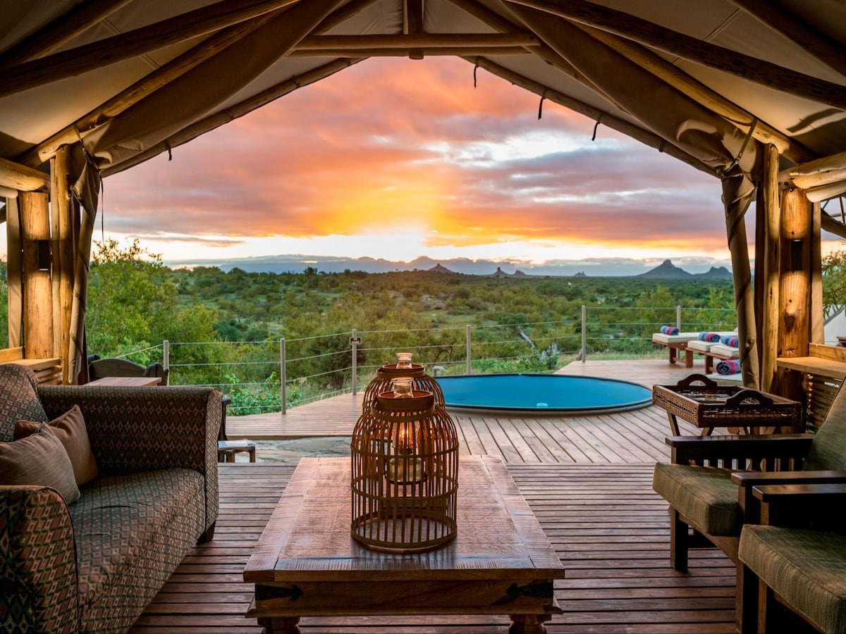 Luxury self catering tented camp in the lowveld bush with stunning mountain views and free roaming wildlife. A truly unique experience where our guests receive an authentic bush experience, with no boundaries between themselves and the naturally occurring animals and birdlife. Sit on your deck with a cup of coffee while a giraffe roams peacefully past you. An opportunity to unwind, recharge and reconnect with nature and yourself.