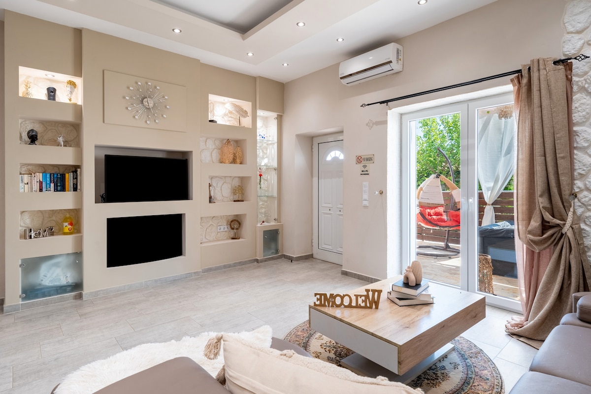 This home is a unique and tranquil getaway, that accommodates a maximum of four people. It retains two en suite bedrooms, with two beds that can turn into double and/or single. A spacious area with a fully equiped kitchen, dining area and living room is also available. Moreover, it has an outdoor swimming pool, relaxing areas and a build-in jacuzzi (outside of the main house). The view of the sea is spectacular, and a moment that no one wishes to miss out on, is the rising sun in the morning !