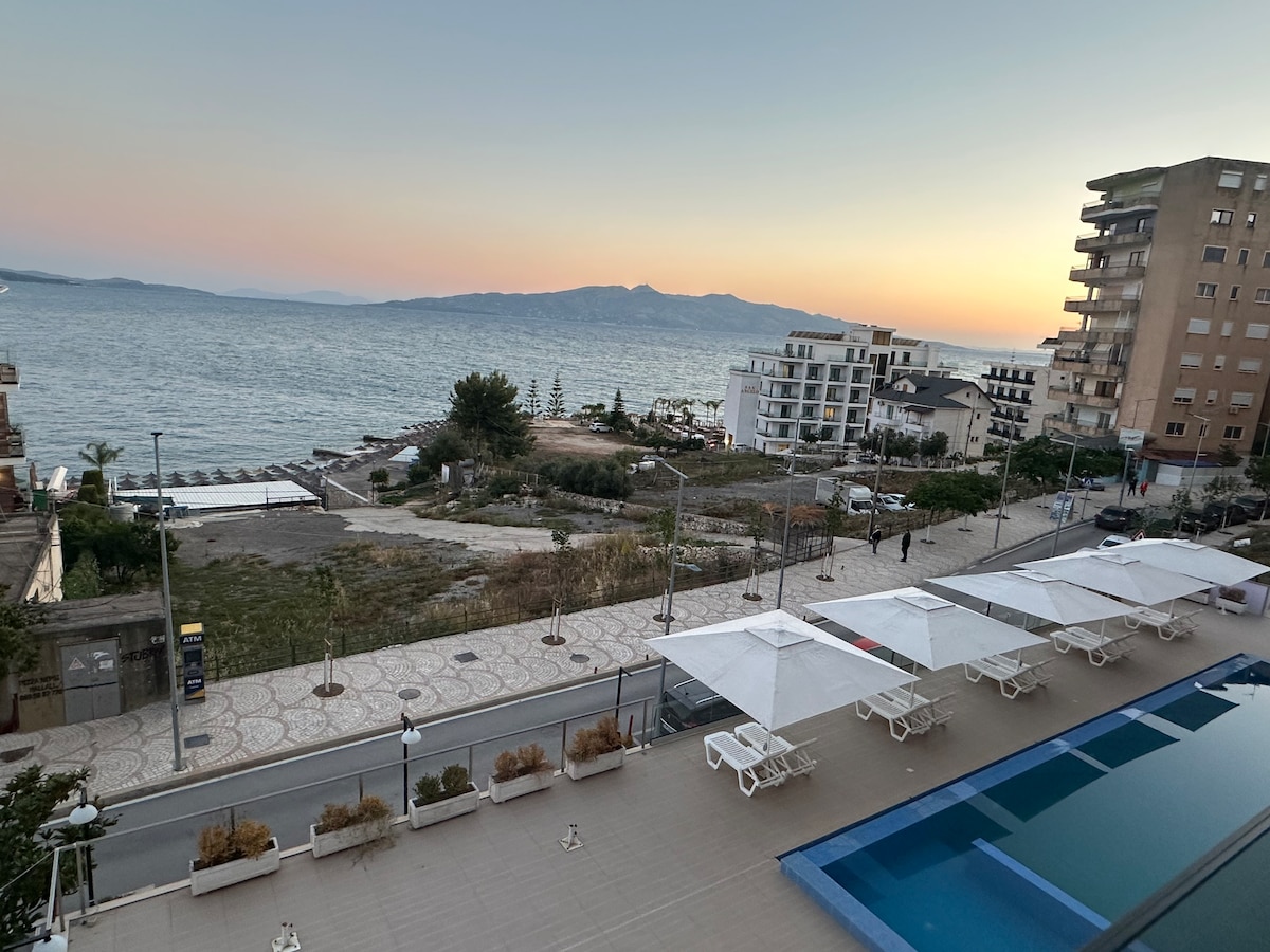 Enjoy the best views of Saranda, the Ionian Sea and Corfu. You'll have privacy and peace of quiet in a spacious apartment. It's located on the hills of Saranda in a quiet neighbourhood, yet only a 15-20 minute walk to the centre of Saranda and a 10 minute walk to the closest beach. The apartment is in a new building (2025) with pool and two balconies, including one with breathtaking views. It has a fully equipped kitchen, dining area, living room, bedroom, and bathroom with a washing machine.