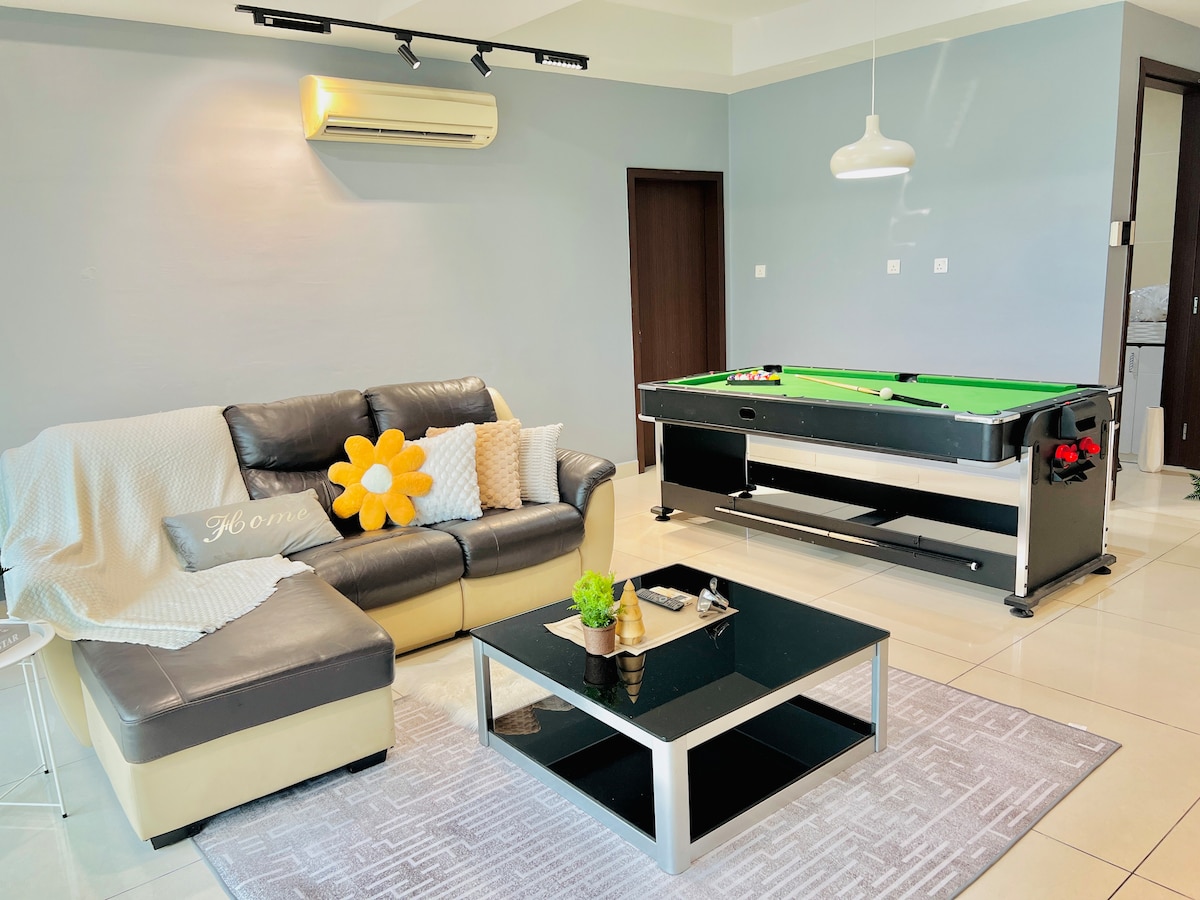 Luxurious spacious 3-Bedrooms unit with Bathtub! Premium quality King & Queen size Beds that guarantee good sleep here with amazing Midvalley Southkey Mall view! Main Highlight! -Private Bathtub -65" Smart TV with YouTube and Netflix apps -Pool Table -Retro Game Console -Drinking water Dispenser Surround with shopping mall & wide range of local tasty food - 2 mins drive to Midvalley Southkey JB - 5 mins to KSL City Mall - 8 mins to City Square Mall & Custom JB