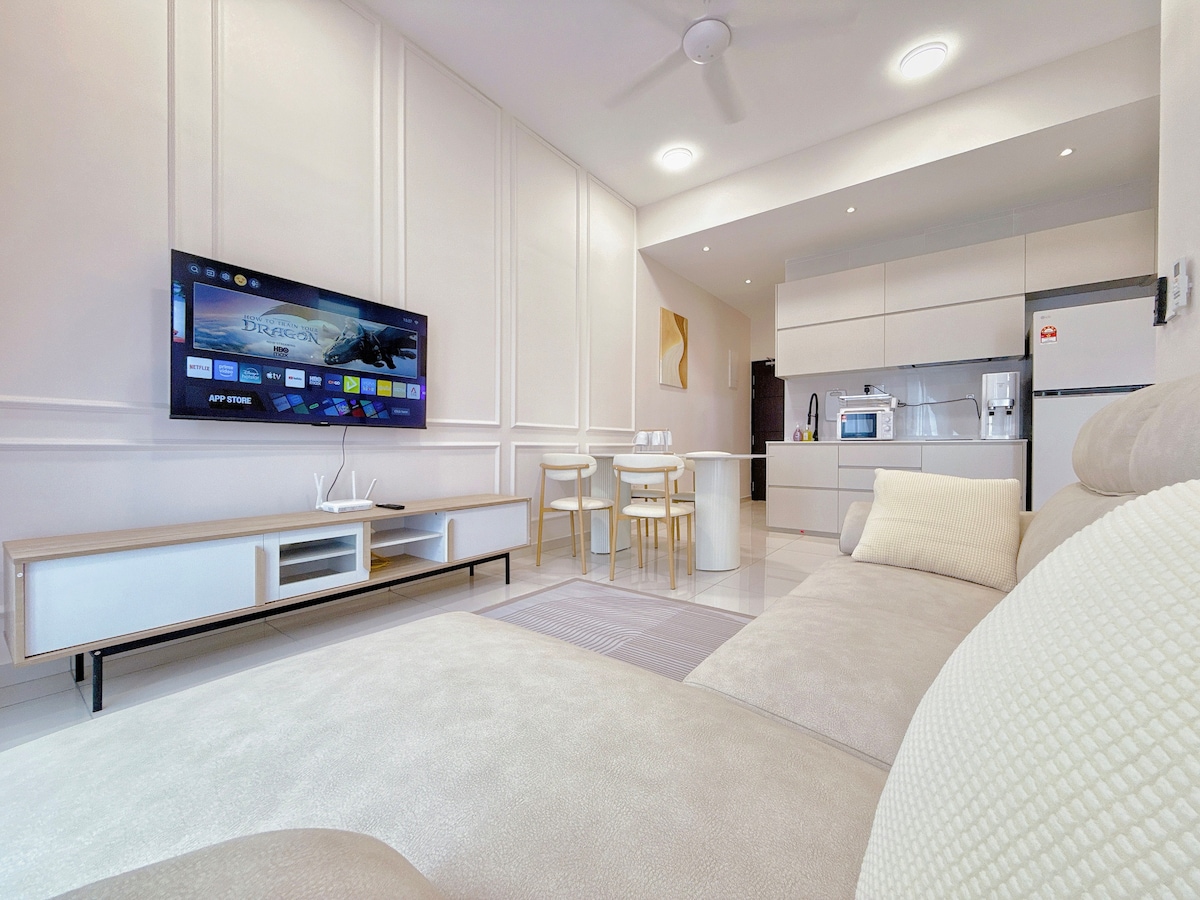 Private Luxury Suite | Walk to KSL Mall • Walking distance to KSL Mall • MUJI-inspired minimalist design • Private Jacuzzi for relaxation • Immersive cinema with surround sound • King-size bed with 12-inch premium mattress • Plush high-end sofa Designed for comfort, privacy, and quiet luxury. Ideal for couples, special occasions, or guests seeking a refined and uninterrupted stay in the heart of Johor Bahru.