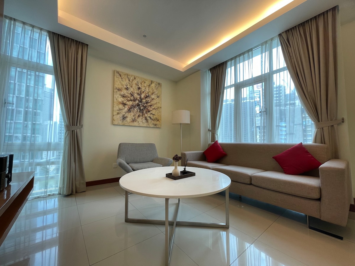 Open bedroom curtains in the morning to reveal a stunning vista of the city—a view shared by a handy work desk. Calming shades of taupe and gray maintain a sophisticated feel. Modern bathroom and kitchen details make this an ideal base for exploring. My estimated 900 sqft one-bedroom service apartment is a fully-furnished and fully air-conditioning with integrated living, dining, kitchen and bedroom areas Living: Comfortable 3 seater sofa, lounger chair and a flat screen TV to give guests a comfortable place to spend leisure time Kitchen: Feel to prepare your own meal? No worries this modern and well-equipped kitchen has everything you want to prepare your food either for yourself or for your love one. Don’t be surprised it even has a washing machine that comes with dryer build in here Dining: A simple and cozy dining table that adjacent to the kitchen for convenient in serving, feel free to prepare your own meal and enjoy eating here as well as to share a laugh and strengthen relationships Bedroom: The place where you hide away at the end of the day to rest, relax before drifting off into blissful sleep, this spacious and comfortable room comes with king size bed, walk in wardrobe and desk, flat screen TV and also private access to superb bathroom will gave you an unforgettable resting environment. Last but not least, Free Wifi internet access is provided for guests to use in my apartment so that guests can stay in touch with friends and family or take care of business anytime The common facilities to Sky Gym, located at 39 floor, Infinity lap pool, game rooms and kids play ground at 5th floor that operate daily from 7.00am to 10.00pm Please ask as much or as little as you like. The apartment is in Fraser Residence Hotel in Central Kuala Lumpur. It's 800 yards from the Petronas Twin Towers and the Suria KLCC shopping center. As for the conveniency, grocery store is just a minute away, public transportation not only can be reached in a few minutes’ walk like Bukit Nanas Monorail Station (5 min) and Dang Wangi LRT Station (7 min) but guests also able to achieve by foot to the nearby Malaysia Tourism Centre (7 min), Petronas Twin Towers (18 min), Hard Rock Café (8 min), Kuala Lumpur Tower (29 min) and many other attractions. There is also a public bus service (GOKL City Bus) that offer riders free of charge for commuters within the Central Business District of Kuala Lumpur, you are welcome to travel around to some of the popular spots like Pavillion, Bukit Bintang, Petronas Twin Tower, Pasar Seni and many more... We provide free cleaning(One Week Once) to those who stay for 7 nights and above which includes changing of Linens, towels and basic cleanup. (Upon Request - One day advance notice) The apartment is in 188 Suites in Central Kuala Lumpur. It's 800 yards from the Petronas Twin Towers and the Suria KLCC shopping center.