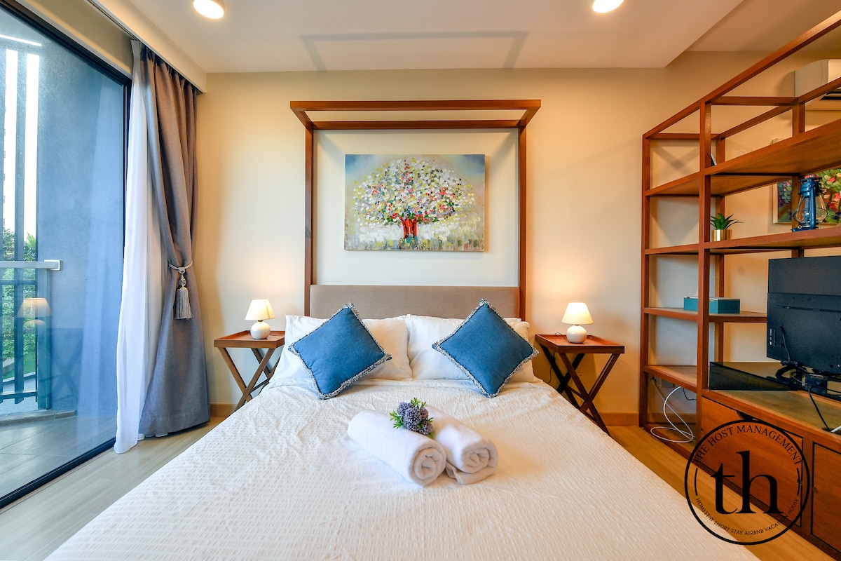 This hyggelig studio apartment features an open-concept living and sleeping area with a queen bed, sliding doors to a balcony with stunning South China Sea views, and a small separate single bedroom. A well-equipped kitchenette (no cooking allowed) and modern bathroom provide everyday comfort. Thoughtful touches include a picnic basket for beach outings and a yoga mat for a peaceful stretch. Ideal for couples or small families seeking a cozy, relaxing seaside escape with unique charm 🐚🌊🌴