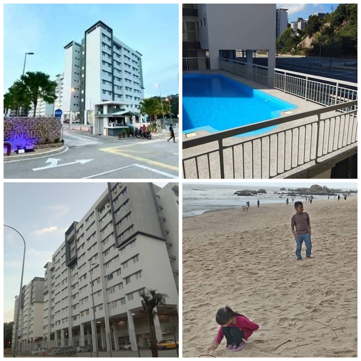 Make some memories at this unique and family-friendly. Located opposite Pantai Pelindung and near the Teluk Cempedak tourist area. It features 3 rooms, 2 bathrooms, and 2 parking spaces. Facilities include a shared swimming pool, air conditioning, Wi-Fi, TV with Netflix, cooking equipment, and an automatic washing machine. The apartment is fully equipped with a master room, a room with double decker beds, and a room with a queen bed. Nearby attractions include beaches, restaurants, and shops.