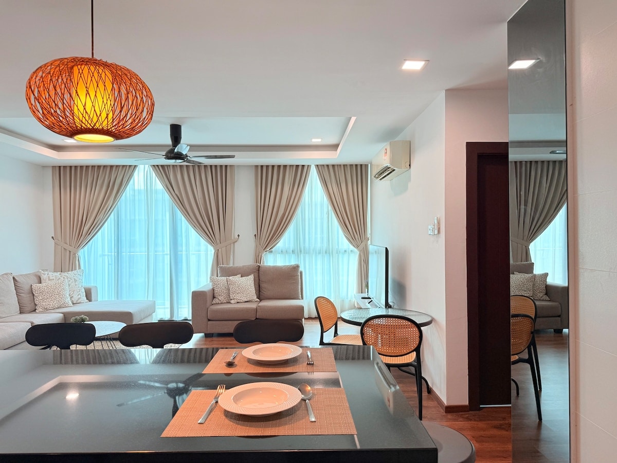 Enjoy an affordable, comfortable, and memorable stay in the heart of Kuching with family and friends. 1. Spacious Living of 2,200sqft living space (excl. balconies) featuring 4 bedrooms, 4 balconies, a stylish bar counter, and a Mahjong table for fun and relaxation. 2. Prime location in the prestigious Green Heights residential area, directly opposite Kuching International Airport. 3. 24-hour security for peace of mind. 4. Free unlimited parking spaces. 5. Flexible check-in and out.