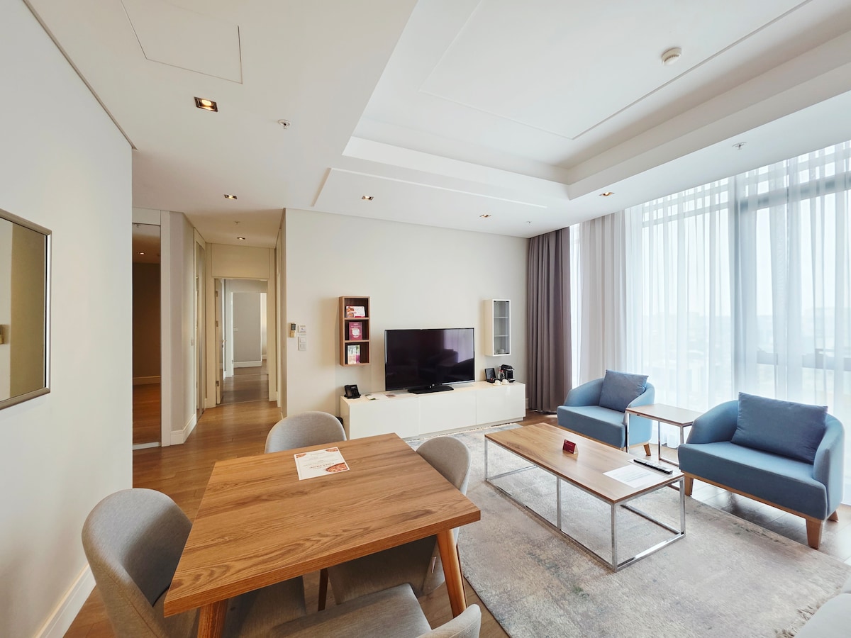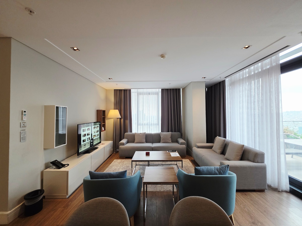 The 70 m² Executive Two Bedroom Suite offers a high level of comfort with its spacious living area and two bedrooms. It features two large double beds and a sofa bed. The suite can accommodate up to 5 guests. Bed type preferences can be requested during the reservation process and are subject to availability.