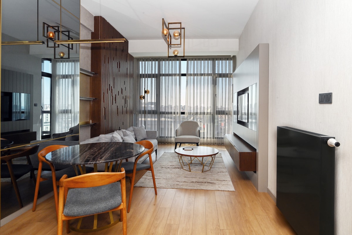 Make your Istanbul memories worth remembering. Enjoy your stay in this 1 bedroom residence in a brand new high rise, a top notch development that deserves appreciation. "G Tower Furnished Apartment Rentals" is pleased to present select number of apartments for short or long term rental at affordable prices. Look us up. Migros, Starbucks, food options and more at the premises. The building is very secure in all aspects. It is located on the European side of city, on Basin Express highway.