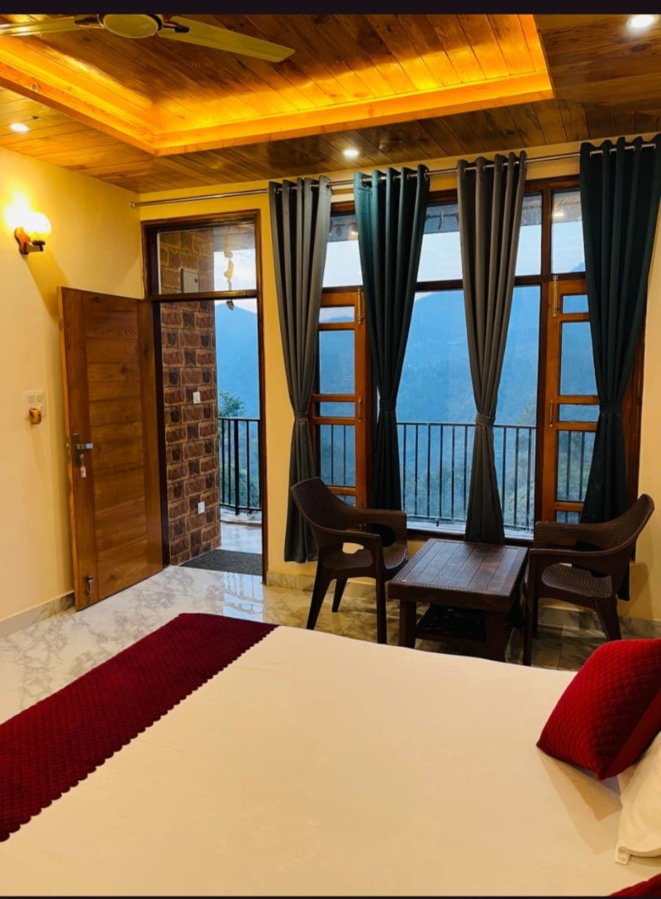 Stone-themed classic cottages equipped with air conditioning, bathtubs, and private balconies offering breathtaking panoramic views of the Himalayan ranges.