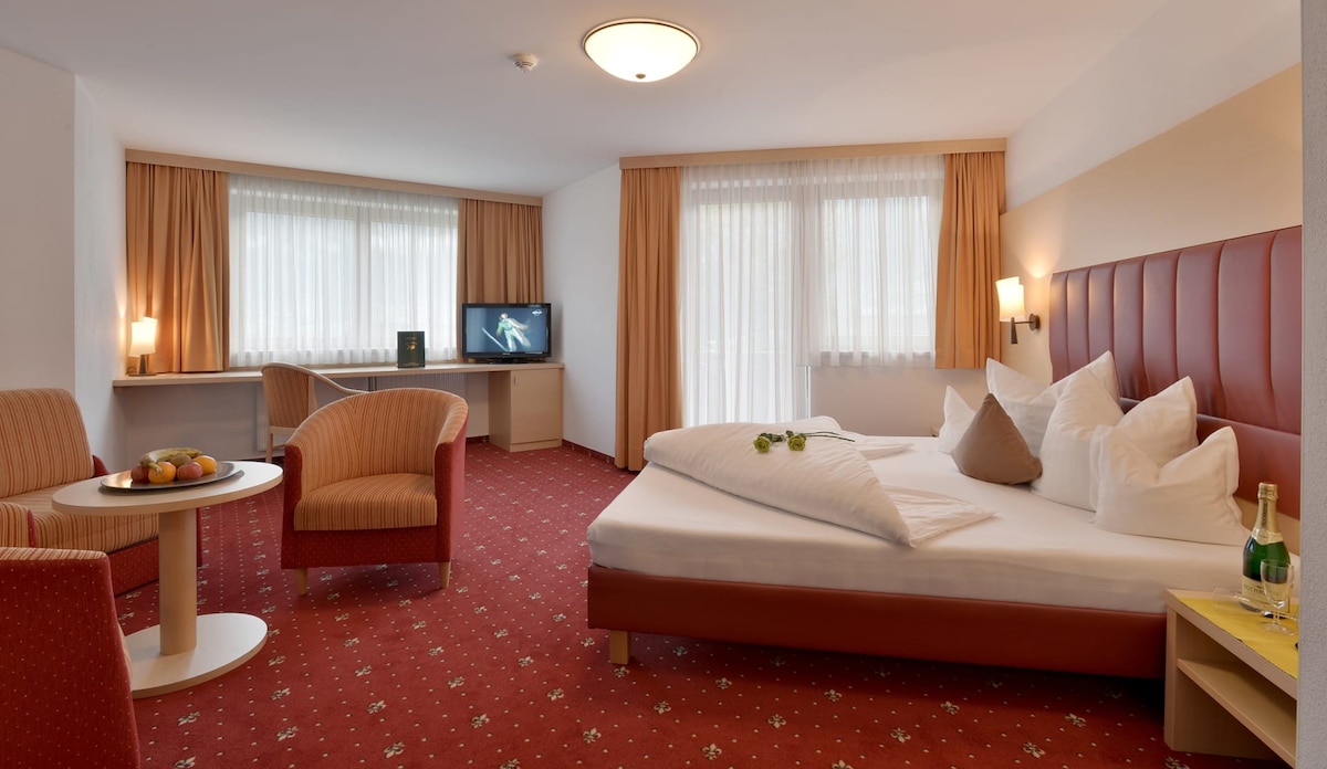 Our family-run 4 star hotel is a 5-minute walk from the town center, with view on the surrounding mountains (all rooms with balcony) in a quiet location. Start with a good breakfast in the morning then, enjoy the beautiful nature and the diverse range of sporting activities. Relax in our sauna or steam room. In the evening you can enjoy your 4 course menu (+ salad buffet) or a la carte our regional specialties., Our single room are on the garden side in the 1. and 2. floor in the home house. Fr