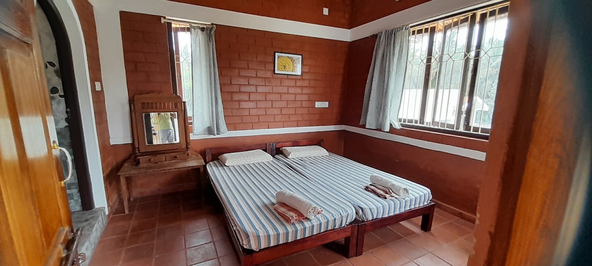 The earthen hut, located amidst the cashew orchard, is a unique pioneer-style hut made of wood, mud, and coconut leaves, using completely sustainable materials. It features a curated open-hut design surrounded by lush greenery, offering guests a unique living experience. The hut includes a kitchen, a separate standalone bathroom, and a pebble-paved patio with seating areas for enjoying coffee! The best corner is the balcony, which offers the guest to witness the sunset, sunrise and stargazing.