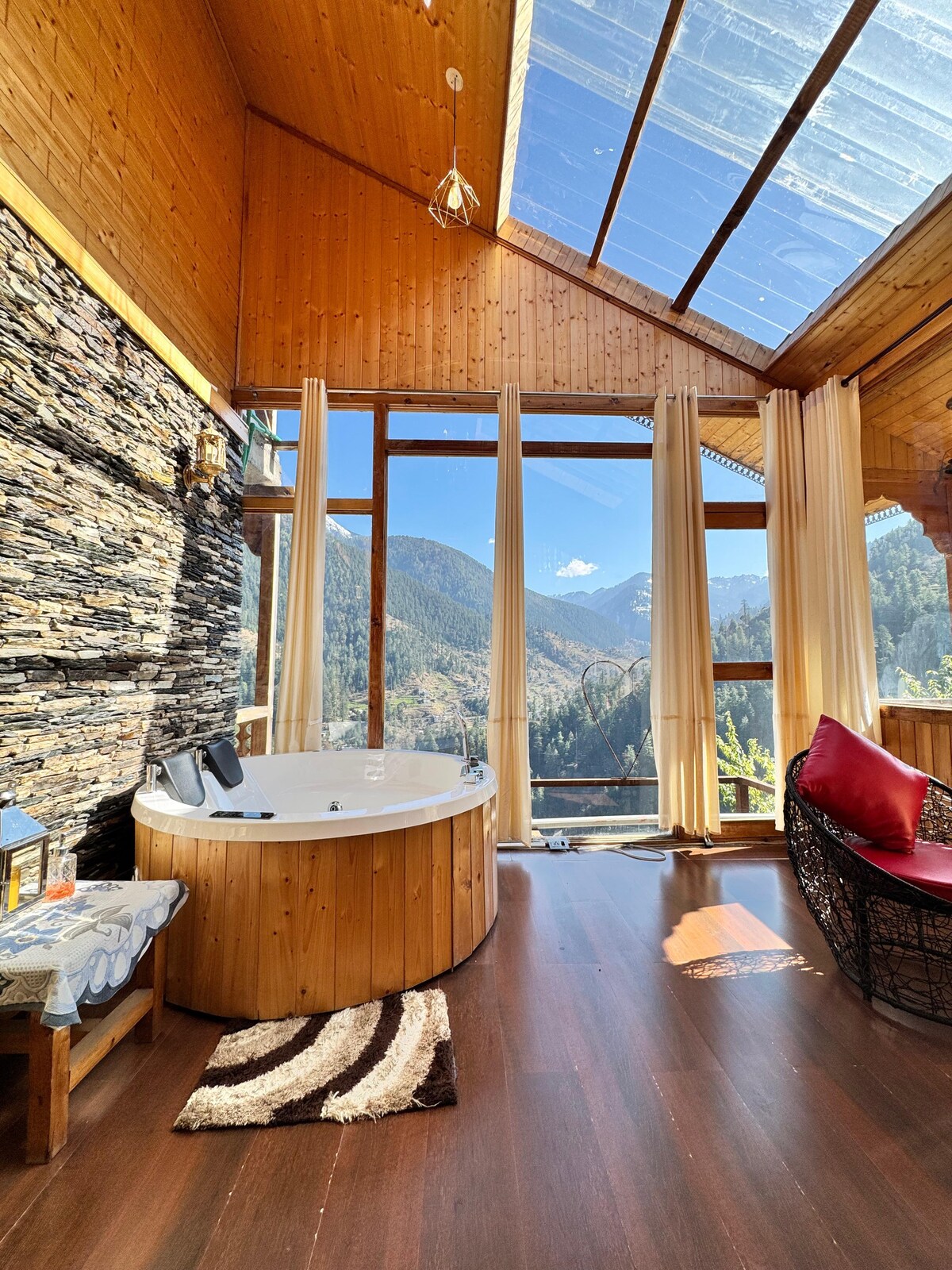 Escape to a cozy hillside duplex in Kullu tucked away in a peaceful yet scenic location overlooking the Beas River valley, which is just 10 mins from Bhuntar, 15 minutes from Dhalpur, 1 hr from Kasol, and 1.5 hrs from Manali. The luxury duplex features wooden interiors, a jacuzzi, PS4, fireplace, balcony, and a full kitchen, making it ideal for families, couples, or friends seeking mountain views, calm vibes, and easy access to the best of the Kullu Valley.