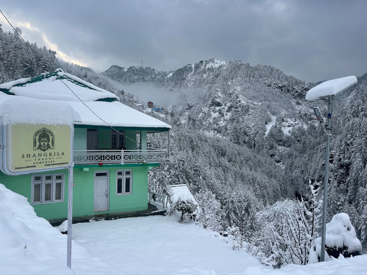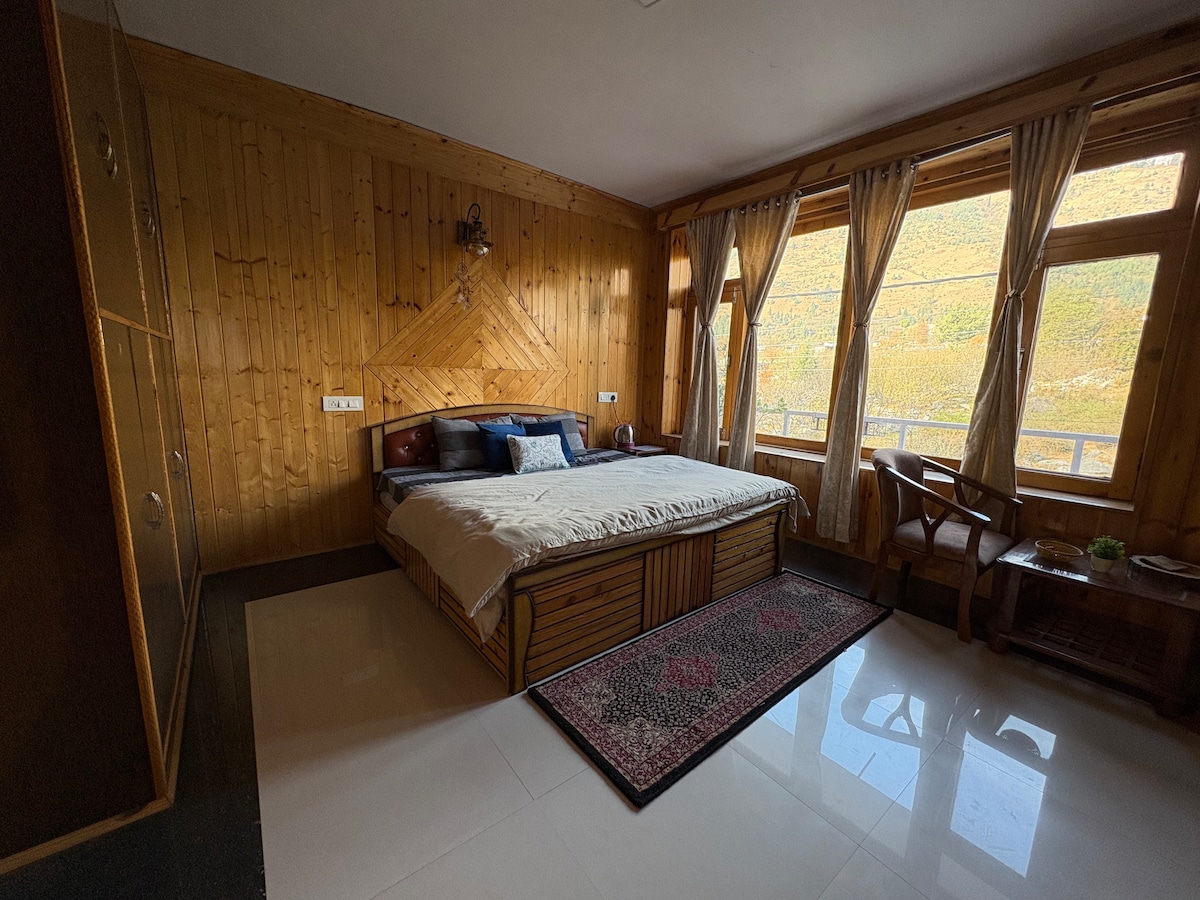 A newly built dedicated double deluxe room standing on the top of the mountain in Manali. It is a private place where only 2 - 3 houses are nearby this place not more than that. This place is unbelievably charming. From your room, you can see the entire valley and the glacier laden Himalayas of Kullu - Manali valley. This brand new double bedded room has attach kitchenette, hygienic washroom, study table, wi-fi and all basic amenities.