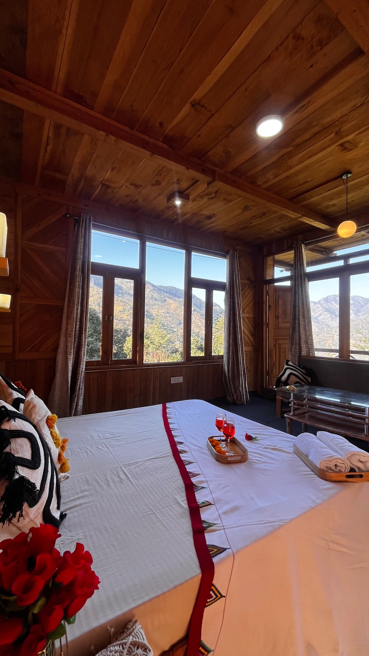 Take a Lazy and Slow Holiday at our unique and secluded cottage. Our cottage is Kathkuni-built, made using upcycled timber and 18inch natural stones that keeps the room insulated at all times, it also has rustic mud interiors that adds to the insulation. The rooms are very spacious, have book nooks, a coffee table and a balcony. We also have an experiential kitchen at our property where we make multi-cuisine food freshly on order.