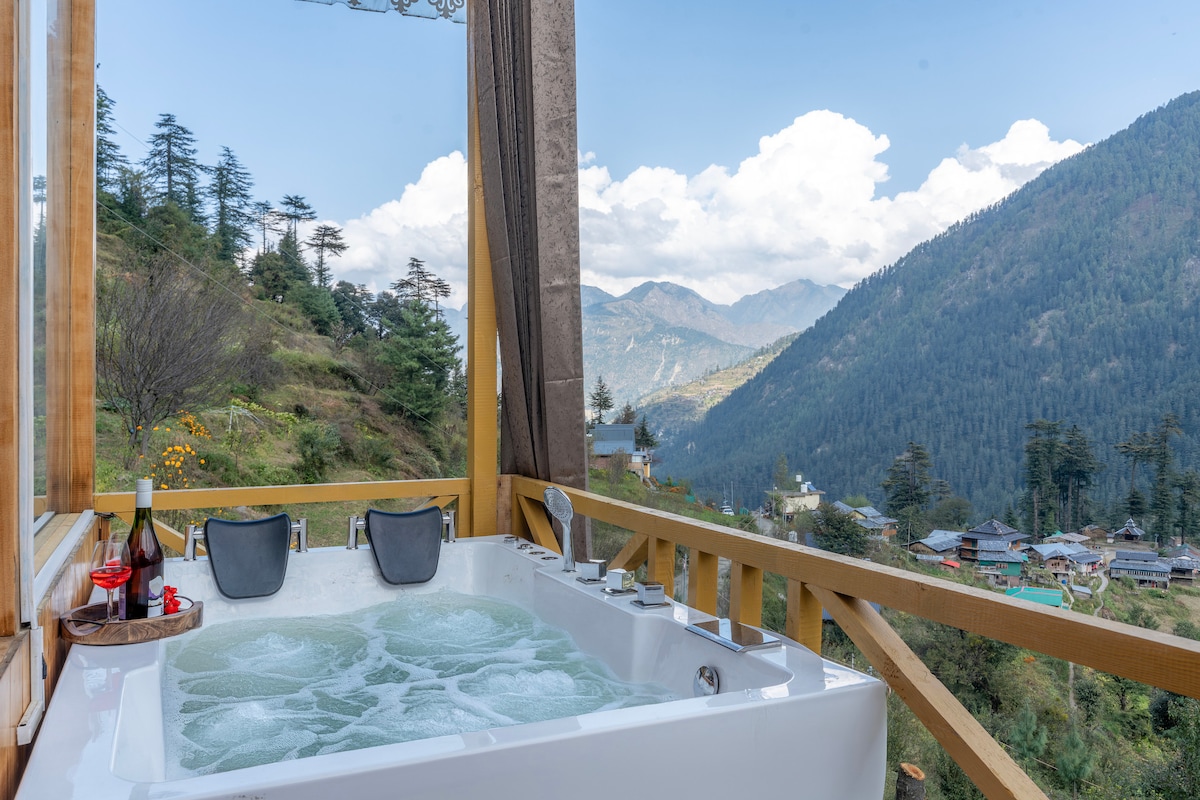 You'll love this unique and romantic escape situated beautifully close to river in Sainj Valley ★ Just near the river ★ Jacuzzi / Hot tub ★ Scenic Location ★ Wi-Fi ★ Food service ★ Bonfire & Garden area ★ Safe Parking Please note, - Breakfast, Room heaters, Bonfire & other services are exclusive of stay price.