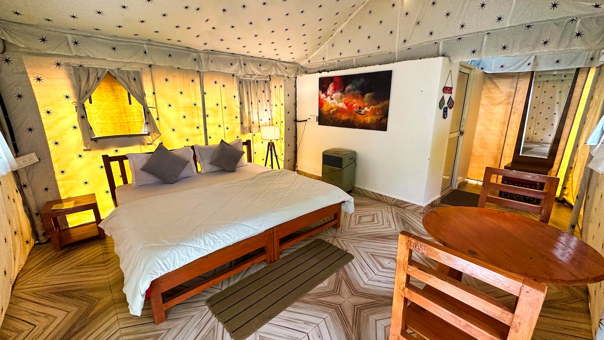 Luxury Camps in Raison: Wake up to epic Himalayan views, unwind under a canopy of stars, & relax in style. ️ 10 spacious tents w/ comfy beds & modern bathrooms. Adventure awaits: paragliding, rafting, & hidden gem exploration. Cozy bonfires, personalized service, & epic mountain memories. Escape the ordinary. Book your unforgettable glamping adventure today!