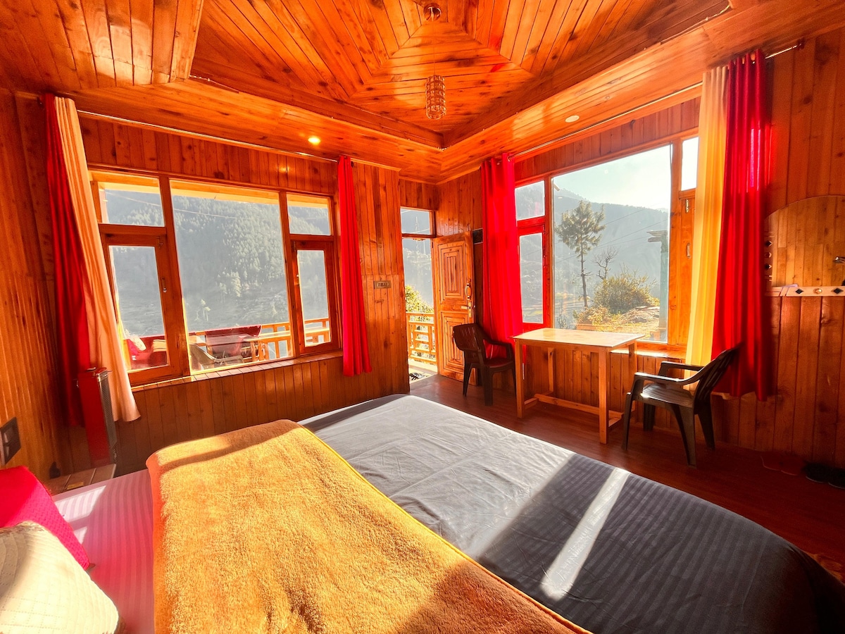 Have fun with the whole family at this stylish place. You will have spacious and Luxury Duplex chalet suitable for one couple or a family of four guests. ★ Master bedroom & attic ★ Wooden & Stone Architecture ★ Panoramic Valley view ★ Nearby Paragliding site ★ Bathtub ★ Power backup ★ WiFi ★ Indoor Fireplace ★ in-house food service ★ Garden & Bonfire area Please note : - Breakfast, Meals, Room heaters, Firewood, & all other services are exclusive of stay price here