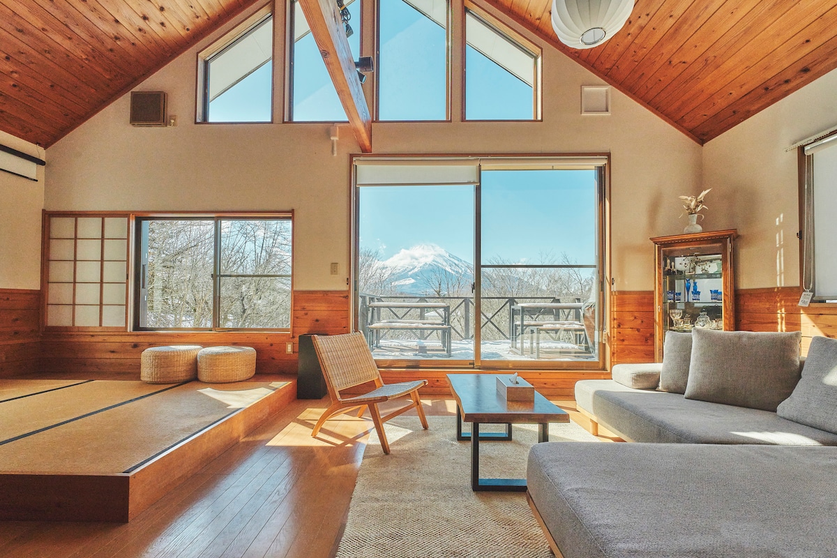 2024年7月にデザイナーによるリフォームをした、山中湖から徒歩11分の別荘地にある 「プライベートリゾート 富士」 という一日一組限定の宿です。 延床面積115㎡、3LDK のログハウスを基調とした和モダンデザイン一軒家で、 2階にあがると、リビングの窓から大きな富士山を望むことができ、富士山をバックに大きなバルコニーでBBQをしたり、木々に囲まれたバレルサウナを満喫した後には、そのまま外の休憩スペースで森林浴をしたりと、していただけます。庭には、大きな焚き火台があり、火を囲んで語らうこともできます。また、庭には高めの柵を設置しているため、愛犬を連れてきても逃げてしまう心配はございません。 部屋には90インチの大型スクリーンがあり、Prime Video、Youtube などが楽しめます。夜には、条件が良ければ満天の星空も見ることができます。