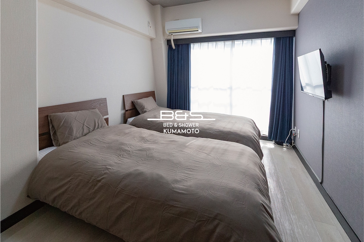 B&S KUMAMOTO MUKAEMACHI 熊本駅や熊本市繁華街から徒歩圏内の1名向けアパートですが補助ベッドを使うと小さな子供を含んだ場合最大3名様で利用可能な長期滞在向け鉄骨造ワンルームアパートメントです。すぐ近くに最大5名可能の木造アパートも3室あり最大18名まででご利用いただけます。 (テレビについての注意事項) 当施設のテレビはスマートテレビとなっており「地上デジタル放送」は映りません。インターネット経由の「Tv.(ティーバー)」や「YOUTUBE(ユーチューブ)」などはスマートテレビでご覧いただけます。長期出張などで地上デジタル放送の映るテレビが必要な場合はオプションにて24型サイズのテレビをレンタル(有料)いただくことが可能です。オプション価格につきましては予約時にお問い合わせください。