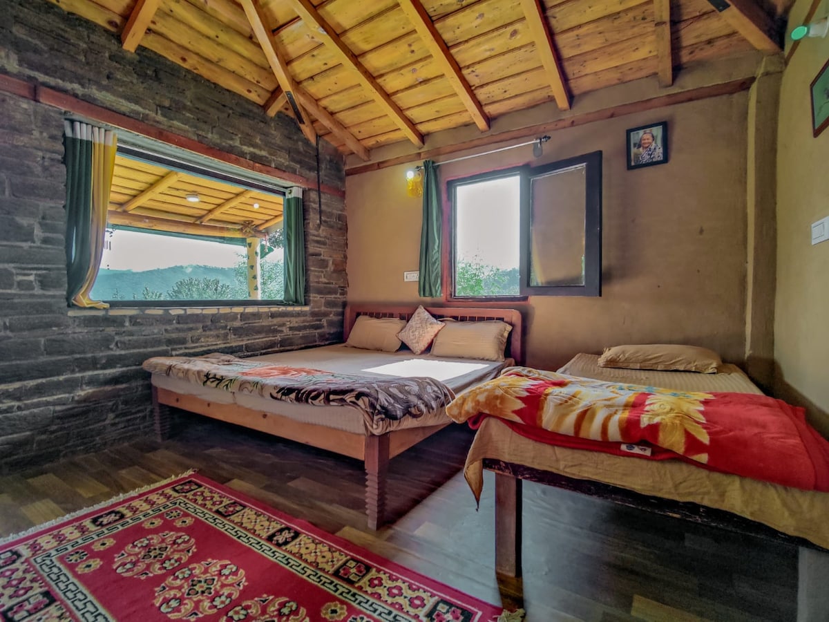 Beautiful “Tree House” is made of pine wood. It is built on Oak Tree with kitchen and a deck which offers beautiful view of valley. A glass window on its roof and stars are visible during autumn when tree sheds its leaves. Woodpecker loves oak tree as small holes on its bark and branches are used to store winter food. A lawn and big courtyard next to tree house is for playing badminton, have evening tea, relax and bird watching. The location is safe for everyone.