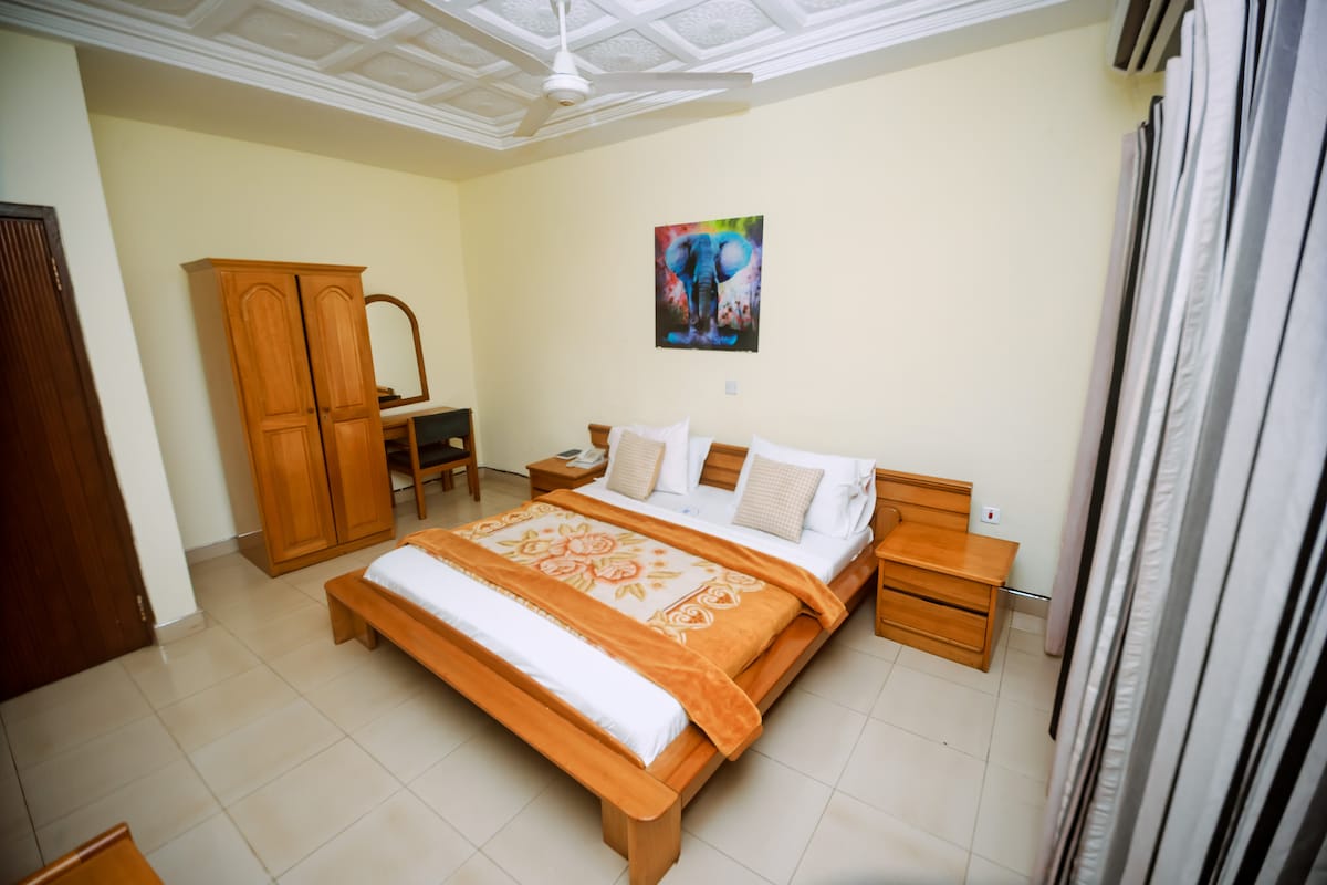This 15-room property is spread on a 1.5 acre land built chalet-style, with each room having its own full private bathroom and balcony.All rooms are very spacious and air conditioned. There's a swimming pool and free WiFi. There's also 24 hour security. Each room costs $55 per night. The location is at the heart of Kumasi(it's a 20 minute drive from the airport and a 15 minute drive from the central business district of Kumasi). Each room comes with FREE CONTINENTAL BREAKFAST