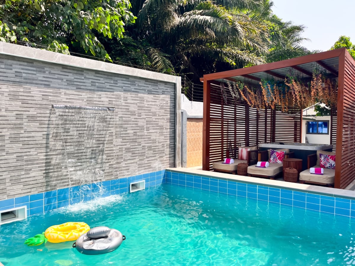 You will enjoy The Oasis like you were at a Beach Resort. And you'll not even realize that you're in the Center of Ghana with no Beach. Built and Furnished for your enjoyment. It comes with a Pool, a Gym, an Entertainment Center, Pergolas with Lounges with Beach Towels, A Jacuzzi under the Pergola for 4 people at a time, Rooftop Summer Hut for Meetings for 20 people, and an Outdoor Dinning Room for 10 people with a Barbecue Grill. And a Large Fully Stoked Kitchen.