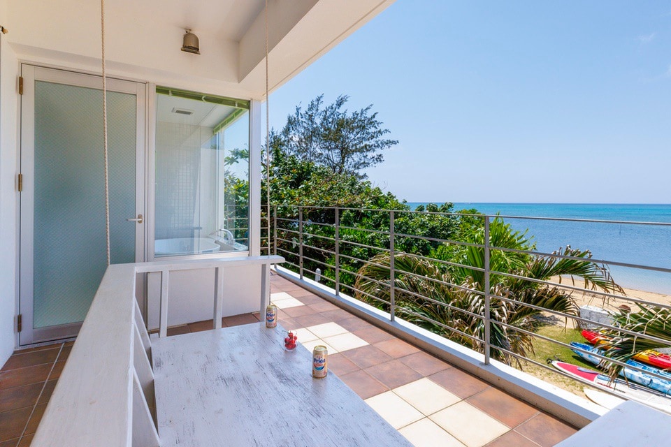 沖縄県でも珍しいホテルから海がすぐそこにある施設です。 ブランコ付きテラスから見れる水平線やサンセットは心を穏やかにしてくれて日頃の疲れを忘れさせてくれます。 透明な海、心地よい波音をテラスやバスタブでお過ごしください。 目の前に谷茶ビーチが広がり開放的な空間です。 爽やかな潮風やオレンジ色のサンセットが幸せな気持ちにさせてくれます。 天気が良い日はバルコニーから名護市や伊江島などを見ることができます。 明るい時間に、ゆっくり海を眺め洋風バスタブで波音を聞きながらリラックス! ベッドルームは1部屋あり最大4名まで宿泊可能。 キッチン、洗濯機、完備しており長期滞在にも最適です。 駐車場は無料で1台駐車可能、無料Wi-Fiを提供しております。 施設周辺は数件の民家のみでとても静かなエリアです。