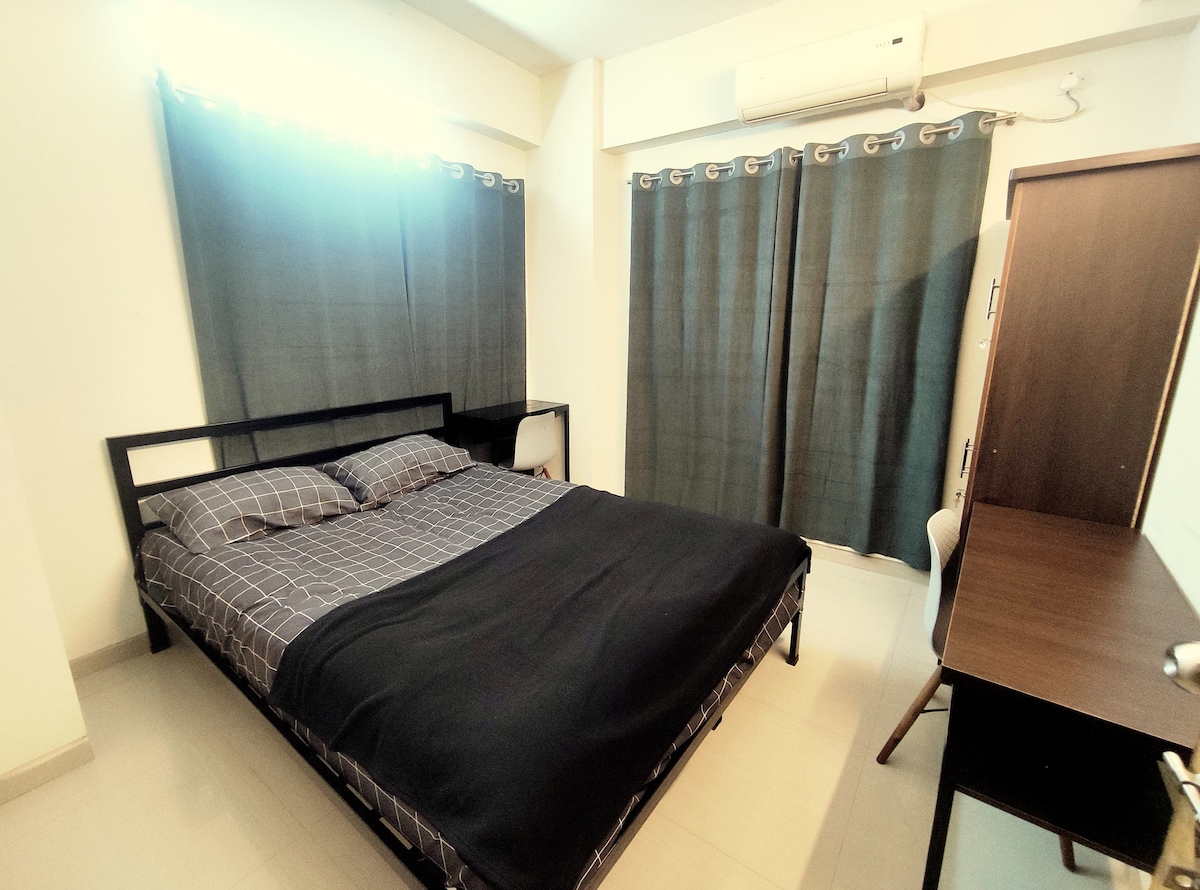 Spacious apartment at the heart of Chittagong. Supermarket, restaurants and transportation only a 5 minutes walk away. Two relaxing air conditioned bedrooms with attached balcony and bathroom each. Fully equipped kitchen and dining for enjoying family meals. Caretaker available next door for any assitance. Free parking, 24/7 security, extra guest room, hot water, fridge, gas stove and all basic amenities available!