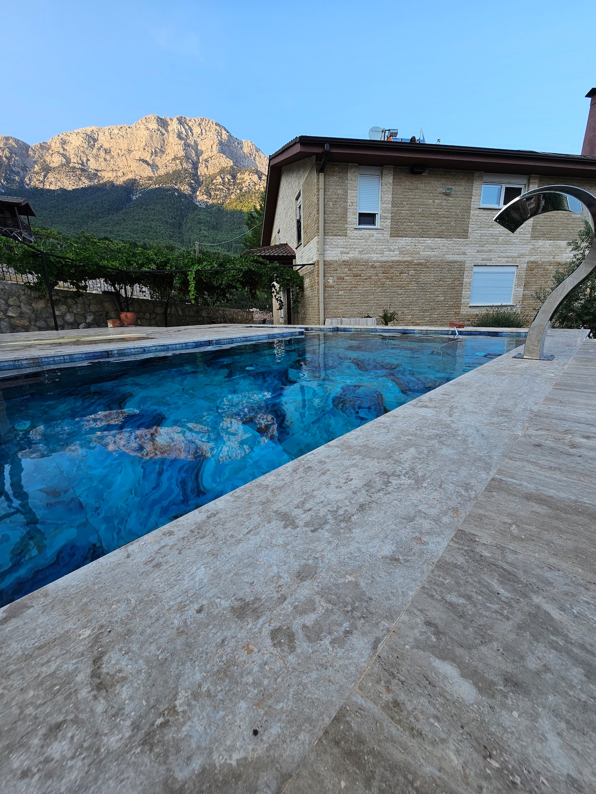 Private gated double fenced guarded hilltop pool Villa with 2 guest houses located on top of Taurus mountains facing to Kumluca, Finike Bay of Mediterranean. Perfect place to have quiet time with family and loved ones. No neighbors around. You have guarded gated entry and 20 minutes to town,hospitals. Antalyanin mavikent beldesinde tepede Kumluca, finike Deniz manzarali, size ozel havuzlu, bahceli, iki misafir evi ve dubleks villadan olusan etrafi iki sira citle cevrilmis ve ozel guvenlikli